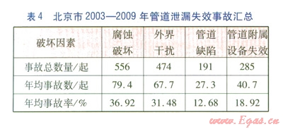 由表l可知,引起北京城市燃氣管道泄漏的原因中,管道腐蝕和外界干擾引起的管道事故所占比例較高,兩者之和超過事故總數(shù)的68%,即管道腐蝕和外界干擾是管道失效的主要原因。此外,從2003年至2009年,外界干擾引起管道失效的比例有明顯下降,而管道附屬設(shè)備失效引起的事故比例有所上升,說明近年來燃氣管道企業(yè)對于管道的管理力度有所加大,社會及施工單位對燃氣管道的安全意識有所加強。而燃氣管道附屬設(shè)備由于種類多、數(shù)量大、分布散等特點,檢測相對復(fù)雜,因此容易被管道巡線檢查所忽視,其逐年升高的泄漏失效率應(yīng)在風險評價中引起足夠的重視。