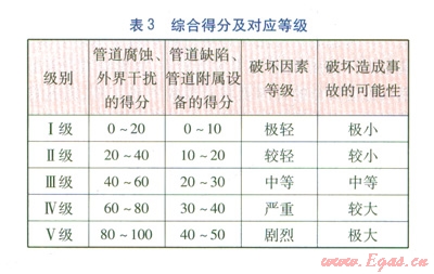 分別對上述各項進行專家評分,在確定各項的得分后,將得分相加得出各項破壞因素的綜合評分,按照表3確定各項破壞因素評估的等級。得分越高,管道可能遭受此種因素破壞的等級越高,管道的綜合安全狀況也越差。