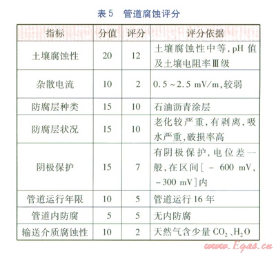 以北京市某段燃氣輸配管道為例,結(jié)合凋查資料以及實際情況,對該段管道的腐蝕破壞等級進行風險評估。該段管道腐蝕評分見表5。