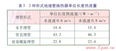 由于采取定入口水溫,不同形式地埋管換熱器單位長度(對于豎直地埋管換熱器為單位鉆孔長度)熱流量不同(見表3)。由表3可知,在運(yùn)行時(shí)間內(nèi),3種地埋管換熱器中豎直埋管換熱器的單位長度熱流量最大。樁基螺旋地埋管換熱器的單位長度熱流量高于水平地埋管換熱器,但樁基螺旋地埋管換熱器的出口水溫在運(yùn)行后期上升較快,可以推斷,隨著運(yùn)行時(shí)間的進(jìn)一步延長,這兩種地埋管換熱器單位長度熱流量的差距會(huì)逐漸縮小。