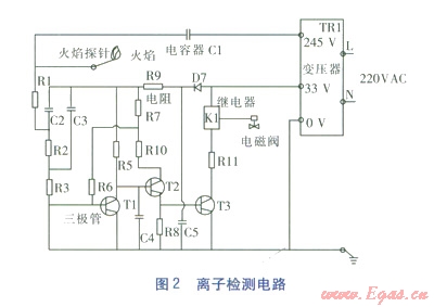 離子檢測是利用火焰燃燒時(shí)產(chǎn)生的外層離子導(dǎo)電原理,外層離子導(dǎo)通電子電路的放大元器件,從而判定火焰狀態(tài)。利用離子檢測的電路很多,現(xiàn)介紹以下電路作為參考,見圖2。