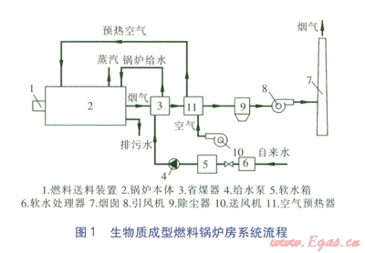 生物質(zhì)成型燃料鍋爐房系統(tǒng)流程見圖l。鍋爐房由鍋爐本體、燃料送料裝置、送引風(fēng)機、軟水處理器、除塵器等組成。鍋爐房的燃料(生物質(zhì)成型燃料)、水、煙氣、空氣的流程與常規(guī)燃煤鏈條爐排鍋爐房近似。