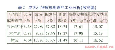 常見生物質(zhì)成型燃料工業(yè)分析(收到基)見表2。由表2可知,與煤相比,生物質(zhì)成型燃料具有以下特點:水分較多,并與生物質(zhì)原料品種有關(guān),且差別較大?;曳州^少,揮發(fā)分較高,固定碳含量較低,高位發(fā)熱量較低。