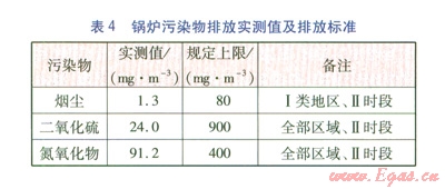 經(jīng)環(huán)保部門檢測,鍋爐污染物排放實測值及規(guī)定上限見表4。執(zhí)行標準為GB l3271-2001《鍋爐大氣污染物排放標準》。由表4可知,各項污染物排放指標符合要求。