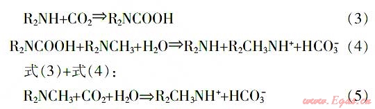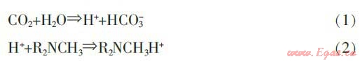 混合胺溶劑可以彌補(bǔ)大量脫除CO2時(shí)MDEA溶液的不足。純MDEA溶液與CO2不發(fā)生反應(yīng),但其水溶液與CO2可按式(1)~(2)反應(yīng):
