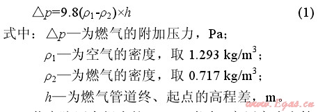 民用天然氣燃具的額定壓力pn=2000Pa,燃具前壓力應(yīng)在(0.75~1.5)pn范圍內(nèi)波動(dòng)(參見《城鎮(zhèn)燃?xì)庠O(shè)計(jì)規(guī)范》(GB50028—2006))。當(dāng)天然氣壓力超出此范圍,燃具的熱效率降低,燃燒不穩(wěn)定,燃燒噪聲大,出現(xiàn)脫火或者回火等現(xiàn)象。目前,安陽(yáng)市高層建筑的燃?xì)庠O(shè)計(jì)主要采用低壓入戶,在計(jì)算低壓燃?xì)夤艿赖膲毫p失時(shí),應(yīng)考慮因建筑高度而引起的燃?xì)飧郊訅毫Α?/span>p,計(jì)算如下: