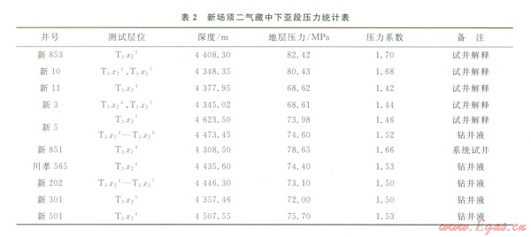 新場氣田須二段氣藏中下亞段共有11個(gè)測試數(shù)據(jù),計(jì)算的地層壓力如表2所示。從表2中可以看出,壓力系數(shù)在1.42~1.70之間一個(gè)較大范圍內(nèi)變化,總體表現(xiàn)出不同目標(biāo)區(qū)(或裂縫體系)壓力系數(shù)不同,如中部裂縫體系壓力系數(shù)高(新851井須二4亞段壓力系數(shù)l.66,新853井壓力系數(shù)1.70),而該裂縫體系以西地區(qū)壓力系數(shù)大幅度降低(新3井壓力系數(shù)1.44、新301井壓力系數(shù)1.50),氣藏東部裂縫體系壓力系數(shù)較低(新5井壓力系數(shù)1.52,新501井壓力系數(shù)1.53),充分說明氣藏?zé)o統(tǒng)一的壓力系統(tǒng)。