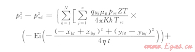 pi為地層原始壓力,Pa;pwf為井底流壓,Pa;N為裂縫條數(shù),條;n為裂縫等分數(shù),個;qfkj為第k條裂縫第j個點匯的產(chǎn)量,m3/s;μg為黏度,Pa·s;psc為臨界壓力,Pa;Z為氣體偏差因子,無因次;T為氣層溫度,℃;K為地層滲透率,mD;h為儲集層厚度,m;t為生產(chǎn)時間,s;Tsc為氣體臨界溫度,℃;xfil為第i條裂縫第l個點匯的橫坐標,m;xfkj為第k條裂縫第j個點匯的橫坐標,m;yfil為第i條裂縫第l個點匯的縱坐標,m;yfkj為第k條裂縫第j個點匯的縱坐標,m;η為導壓系數(shù),0.