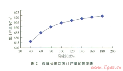 圖2是不同裂縫半長生產(chǎn)1年的累計產(chǎn)量結果??梢钥闯?,隨著裂縫長度增加,累計產(chǎn)量逐漸增大,隨著裂縫長度進一步增加,增幅變小。這是因為裂縫長短反映了儲層的供氣面積大小。當裂縫長度增加到一定程度后,縫長越大,氣體在裂縫中流動時的摩阻越高,反而會影響產(chǎn)量。在本算例中,最佳裂縫半長為60~80 m。