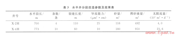 依據(jù)上述研究論證結果,確定了合理的壓裂水平井參數(shù),以保證投資最少、開發(fā)效果最優(yōu)為目的。使用優(yōu)化的壓裂水平井裂縫參數(shù)在該區(qū)塊應用了8口井,單井無阻流量7.2×104~27.6×104 m3/d.平均無阻流量為16.3×104 m3/d,與參數(shù)優(yōu)化前的無阻流量9.8×104 m3/d相比,增產(chǎn)效果顯著。