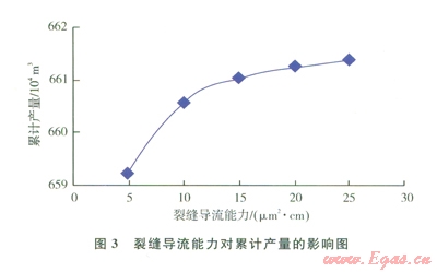 圖3是累計產(chǎn)量與裂縫導流能力的關系曲線??梢钥闯觯嬖诶塾嫯a(chǎn)量與裂縫長度相似的變化規(guī)律。隨著導流能力增加,累計產(chǎn)量先逐漸增大后趨于平穩(wěn)。要充分發(fā)揮致密氣藏壓裂水平井的潛能,就要使裂縫導流能力與地層滲透率相匹配。本算例中,推薦最佳裂縫導流能力為10~15μm2·cm。