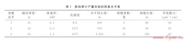 將儲層厚度、滲透率、孔隙度、水平段長度、裂縫條數(shù)、裂縫長度、裂縫導流能力作為影響累計產(chǎn)量的7個因素,再根據(jù)各因素選取了3個水平(表1)。