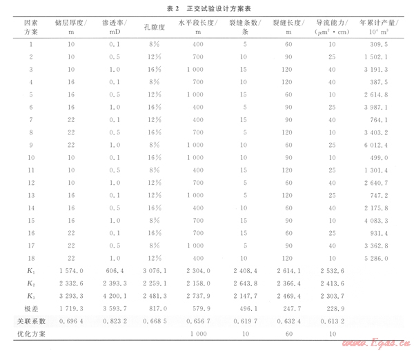 為了檢驗排序結果的正確性,進一步采用灰色關聯(lián)分析進行檢驗。以表2正交試驗設計方案表的數(shù)據(jù)為依據(jù)進行了計算。其中取水平井累計產(chǎn)量作為參考數(shù)列,7個因素作為比較數(shù)列,計算了各因素與累計產(chǎn)量的關聯(lián)系數(shù),其數(shù)值大小就反映了因素對產(chǎn)量影響的重要程度。計算結果見表2,兩種方法的排序完全一致,驗證了結果的準確性。