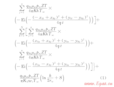 將裂縫單翼均等分成竹份,每等份可以看成是一個點匯。利用無限大均勻地層點匯定流量的壓降公式,可以求出該點匯對地層中任意一點產(chǎn)生的壓降[8-10];將地層任意一點替換為裂縫尖端,就可以得到所有點匯同時生產(chǎn)時對裂縫尖端產(chǎn)生的壓降;考慮到裂縫半長遠大于水平井筒半徑,裂縫內(nèi)流體從裂縫邊緣向井筒周圍聚集,第i條裂縫可以看成是流動直徑為裂縫長度、地層厚度為裂縫寬度、邊界壓力為裂縫尖端壓力、井底流壓為水平井井筒內(nèi)壓力的微型平面徑向流油藏;根據(jù)壓力連續(xù)和流量守恒方程,就能得到考慮裂縫干擾的壓裂水平井油井產(chǎn)量預測模型[2,5];進一步根據(jù)壓力函數(shù)的定義和真實氣體狀態(tài)方程,并將地層條件下的產(chǎn)量換算為地面標準情況下氣體產(chǎn)量,就可以得到氣藏壓裂水平井產(chǎn)量預測模型: