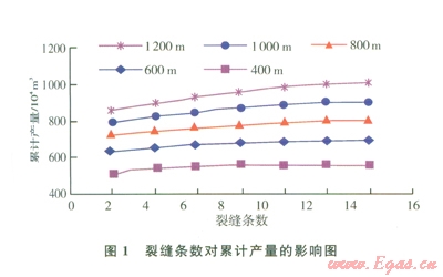 圖1是不同水平段長度、不同裂縫條數(shù)下生產(chǎn)l年的累計產(chǎn)量??梢钥闯?,隨著裂縫條數(shù)增加,累計產(chǎn)量先增加最后趨于平穩(wěn)。因為隨著裂縫條數(shù)增加,裂縫間距變小,相互間干擾加重,導致每條裂縫產(chǎn)量減小造成的??紤]到裂縫條數(shù)增加,作業(yè)成本增大,因此存在一個最佳裂縫條數(shù)。當水平段長度為