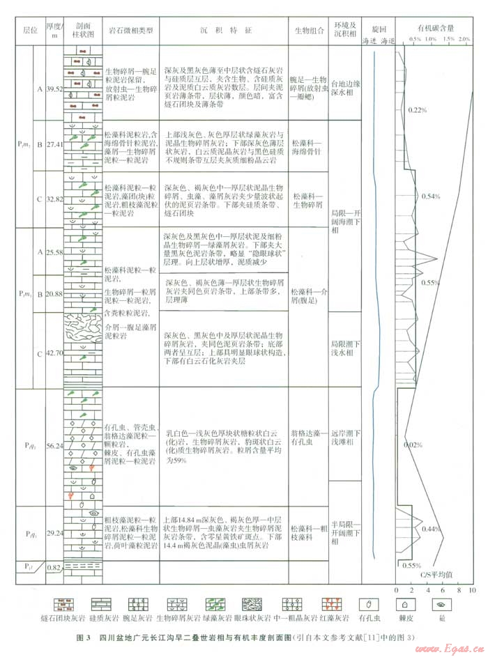 摘要 基于頁巖氣“源藏合一”的成藏模式——天然氣源自頁巖有機質(zhì)(固態(tài)、液態(tài))吸附、溶解及黏土礦物吸附的機制以及微裂縫、裂縫、頁巖孔隙中的游離氣成藏的認(rèn)識,以四川盆地下二疊統(tǒng)為研究對象和實例,論證了同為烴源巖的碳酸鹽巖(富含有機質(zhì)的局限-開闊海臺地相等的細(xì)結(jié)構(gòu)-生物泥粒、泥粒-泥質(zhì)灰?guī)r、泥灰?guī)r等)也應(yīng)該具有天然氣成藏的前景和可能。研究區(qū)下二疊統(tǒng)碳酸鹽巖烴源巖發(fā)育,在棲霞組(P1q)和茅口組(P