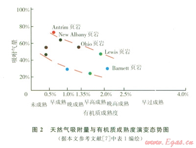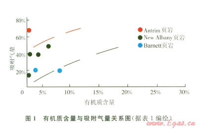 據(jù)本文參考文獻(xiàn)[7-8],從表l資料編繪的圖l中可以看出,頁巖氣的吸附量與其有機質(zhì)豐度呈正相關(guān)態(tài)勢,即有機質(zhì)含量增高其吸附氣量亦增加。