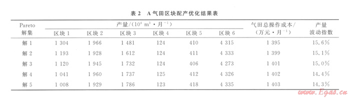 表2給出模型的Pareto解集,該解集包含5個(gè)Pareto解,這5個(gè)解滿足約束條件,總操作成本介于1 395~1 403萬元/月,產(chǎn)量波動(dòng)指數(shù)在14.3~15.6范圍內(nèi),均優(yōu)于按同比例增長方案。決策者可以根據(jù)各區(qū)塊實(shí)際情況,在上述解中選取一組進(jìn)行調(diào)峰配產(chǎn)。