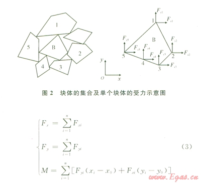 式中Fx、Fy分別為x、y方向上的合力;M為合力矩。其中(x0,y0)為塊體B質心坐標,力矩以逆時針方向為正。對公式(3)求導可以得出塊體質心的運動方程,對質心的運動方程進行向前差分格式數值積分可以得到巖塊質心沿x或y方向的速度和位移。