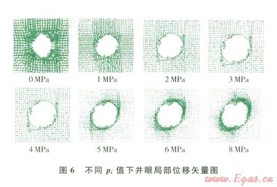 通過改變井眼有效壓力值pi (pi=0 MPa、1 MPa、2 MPa、3 MPa、4 MPa、5 MPa、6 MPa、8 MPa),得出相應壓力值下形成井眼后模型的各種宏觀、微觀變化。
