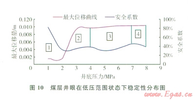 從圖l0上看,安全系數越高,而最大位移量越小,即兩者重合區(qū)域最大范圍即為最佳穩(wěn)定區(qū)間,故將煤層在低壓范圍內井壁穩(wěn)定性分為4個部分,其中1區(qū)間由于位移量最大,安全系數最低,故該煤層在該區(qū)間的井內壓力下,井壁極其不穩(wěn)定;在區(qū)間2、區(qū)間4位移曲線和安全系數圍成區(qū)間幾乎相當,可以預見這兩個壓力區(qū)間內井壁穩(wěn)定性等級相當;區(qū)間3最大位移量在整個模擬過程中趨于最小范圍,而安全系數保持在較高水平,故該區(qū)間內煤層穩(wěn)定性系數最高。所以,當井底壓力在4~7 MPa區(qū)間時,煤層井壁在該煤層參數下最佳穩(wěn)定。