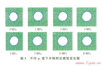 由圖5模擬結果顯示,改變井眼有效壓力值pi井眼形狀未發(fā)生較大變化,井眼形狀保持完好(圖中藍色區(qū)域),說明井壁未出現(xiàn)明顯垮塌或縮徑,只是局部塊體發(fā)生分離(圖中紅色區(qū)域),節(jié)理間距略有變化。