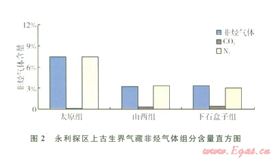 本區(qū)上古生界天然氣中含量最高的非烴氣體為氮?dú)?,含量一般?span lang="EN-US">3%以上。太原組天然氣組分中氮?dú)夂繛?span lang="EN-US">7.36%;山西組氣藏中氮?dú)夂坑兴档?,分布范圍?span lang="EN-US">2.15%~3.41%,均值為2.88%;下石盒子組氮?dú)夂颗c下部的山西組氣藏相近,均值為3.Ol%(表1、圖2)。這一分布特征與區(qū)塊北部的天環(huán)北段和橫山堡氣田的天然氣中氮?dú)夂拷?,要高于榆林、神木、米脂等氣田。由此可見,?gòu)造活動(dòng)較為強(qiáng)烈的西緣逆沖帶為整個(gè)鄂爾多斯盆地氮?dú)夂肯鄬^高的區(qū)域。這一現(xiàn)象說明天然氣中氮?dú)夂康脑黾又饕c氣藏的保存條件有關(guān),但也可能有深大斷裂造就的深源氮?dú)獾呢暙I(xiàn)。