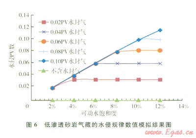 為了進一步研究儲層產水的宏觀機理,開展了兩種氣水狀態(tài)下的物理模擬實驗和數值計算。一種是氣水分異明顯的儲層,一種是氣水互封狀態(tài)下的儲層再,對比分析水封氣狀態(tài)及氣、水能量對儲層產水的影響規(guī)律。結果表明,對于氣水分異明顯的低滲儲層,由于水相彈性膨脹能力小,且儲層滲透率低,儲層產水量很小,而且水體倍數對其影響也很小,對于氣體產能影響不大,可以忽略不計。對于氣水互封的儲層,采氣過程中巖心的水侵量達到了0.2 PV,會嚴重影響氣體產能,可見氣水存在關系對于氣井產水有重要影響。圖6是不同水封氣量下氣井開發(fā)過程中的水侵動態(tài)數值計算結果,發(fā)現(xiàn)水封氣能量越高,儲層越容易產水;隨可動水飽和度增加(對于束縛水飽和度一定的儲層,即原始含水飽和度增加),氣井開發(fā)過程中的水侵量顯著增加,南不含水封氣到0.1 PV水封氣,對應的水侵量由0增加到近0.12 PV,嚴重影響氣井產能。由此可見,低滲儲層產水量主要受到兩方面的宏觀因素控制:一是水封氣能量大小,二是可動水飽和度高低。