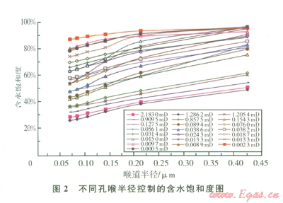 1)須家河組低滲透砂巖儲層孔喉細小,微孔喉發(fā)育,小于0.1μm的微孔喉控制的孔隙體積比在30%以上;微孔喉毛細管阻力大,氣相難以進入其控制的孔隙內,導致儲層高原始含水飽和度。