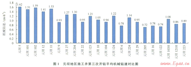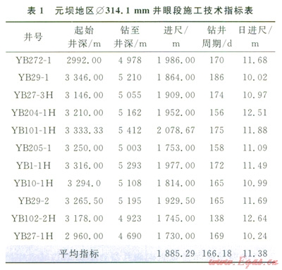 截至2013年4月,除YB27-2井外,中國(guó)石化西南油氣分公司在元壩地區(qū)部署的產(chǎn)能建設(shè)井均完成第三次開(kāi)鉆。從表1中可以看出,采用推薦的技術(shù)集成應(yīng)用后,無(wú)論是鉆井周期還是日進(jìn)尺均優(yōu)于前期施工井。ll口井第三次開(kāi)鉆平均鉆井時(shí)間166.18d,較前期平均值縮短34d。