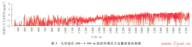 根據(jù)井壁穩(wěn)定性分析結(jié)果,深度小于2800m的地層當(dāng)量應(yīng)力低于地層巖石的綜合強(qiáng)度,氣體鉆井井壁穩(wěn)定性較好如圖2,而深度超過(guò)2800m的地層坍塌密度高于空氣鉆井臨界坍塌壓力當(dāng)量密度值(圖3),這些層段‘營(yíng)氣鉆井過(guò)程中存在垮塌掉塊,可通過(guò)優(yōu)化鉆井參數(shù)來(lái)克服,并做好氣液轉(zhuǎn)換準(zhǔn)備;千佛崖組—須家河組地層氣體鉆井穩(wěn)定性較差,YB3井在自流井組3727.8~3791.5m應(yīng)用氮?dú)忏@井,僅進(jìn)尺63.7m,不但后期通井循環(huán)時(shí)間較長(zhǎng),鉆井費(fèi)用也有所增加,在目前技術(shù)條件下該井段采用氣體鉆井還存在一定難度。