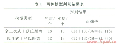 從表l中可以看出,兩個(gè)模型對(duì)整個(gè)樣本的判別正確率均在75%以上,統(tǒng)計(jì)意義上是有效的判別模型[16-17]。判別結(jié)果顯示,歐氏模型對(duì)氣層確實(shí)有很好的識(shí)別效果,而馬氏模型對(duì)水層有很好的識(shí)別效果,說明了各氣體組分之間的相互關(guān)系是氣測(cè)資料識(shí)別流體性質(zhì)的基礎(chǔ),在流體判別模型中采用不同空間距離計(jì)算方法確實(shí)能提高模型識(shí)別不同流體性質(zhì)的能力。