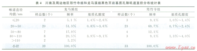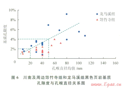 筇竹寺組頁(yè)巖樣品孔喉直徑均值一般介于7~105nm,樣品孔喉直徑分布頻率為低于20nm的樣品占9.1%,20~50nm的樣品占69.7%,50~80nm的樣品占12.1%,80~110nm的樣品占9.1%,即直徑小于50nm的中小孔隙占78.8%,直徑大于50nm的大孔隙僅占21.2%。龍馬溪組頁(yè)巖孔喉直徑均值一般介于8~160nm,樣品孔喉直徑分布頻率為低于20nm的樣品占5.1%,20~50nm的樣品占51.3%,50~80nm的樣品占l7.9%,80~110nm的樣品占20.5%,大于ll0nm的樣品占5.1%,即直徑小于50nm的中小孔隙占56.4%,直徑大于50nm的大孔隙占43.6%(為筇竹寺組的2倍)。兩套海相頁(yè)巖基質(zhì)孔隙度與孔喉直徑均值都具有較好的正相關(guān)性(圖6),孔喉直徑均值為50nm以上、20~50nm和20nm以下的樣品分別具有2.7%~6.9%(平均為4.9%)、0.7%~3.6%(平均為2.1%)和1.0%~l.9%(平均為1.4%)的基質(zhì)孔隙度。這表明,要形成孔隙度在2%以上的有效頁(yè)巖儲(chǔ)層,孔喉直徑均值一般需要超過20nm;要形成孔隙度超過4%的優(yōu)質(zhì)頁(yè)巖儲(chǔ)層,孔喉直徑均值需達(dá)到50nm以上??梢?,在頁(yè)巖納米級(jí)孔隙系統(tǒng)中,對(duì)基質(zhì)孔隙度貢獻(xiàn)最突出的是孔徑超過50nm的大孔隙,其次是孔徑介于20~50nm的中孔,而貢獻(xiàn)最小的是孔徑低于20nm的微小孔(對(duì)應(yīng)的孔隙度一般低于2%);筇竹寺組頁(yè)巖以孔徑低于50nm的中小型孔隙為主,而孔徑超過50nm的大孔隙明最少于龍馬溪組,這是導(dǎo)致該頁(yè)巖基質(zhì)孔隙度明顯減少并低于龍馬溪組的重要原因之一。