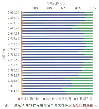 筇竹寺組黑色頁(yè)巖基質(zhì)孔隙度為l.4%~3.1%(圖2),約為龍馬溪組富有機(jī)質(zhì)頁(yè)巖段的1/3~1/2。在基質(zhì)孔隙中,有機(jī)質(zhì)孔隙占1.7%~43.2%(平均為18.6%),黏土礦物層間孔隙占53.9%~97.4%(平均為79%),脆性礦物孔隙占0.8%~3.1%(平均為2.4%)(圖3)。在2794~2819m富有機(jī)質(zhì)頁(yè)巖段,巖性以黑色硅質(zhì)頁(yè)巖為主,微含鈣質(zhì),TOC、黏土礦物和脆性礦物3者含量分別為2.4%~3.6%、l4%~27%、72.8%~85.7%,計(jì)算的總孔隙度為l.4%~2.0%,其中有機(jī)質(zhì)孔隙占20%~43%(平均為34%),黏土礦物層間孔隙占53.9%~77.8%,脆性礦物孔隙僅占l.9%~3.1%(圖3)。