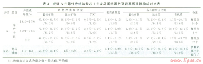筆者所在的課題組曾對(duì)川南龍馬溪組頁(yè)巖開展了儲(chǔ)集空間定量表征研究,通過建立頁(yè)巖三層巖石物理模型(即脆性礦物層、黏土層和有機(jī)質(zhì)層三層模型)及其孔隙度數(shù)學(xué)模型[11],對(duì)龍馬溪組富有機(jī)質(zhì)頁(yè)巖段基質(zhì)孔隙構(gòu)成和裂縫發(fā)育狀況進(jìn)行了定量表征,揭示了龍馬溪組頁(yè)巖儲(chǔ)集空間的四大特征[11]。這些成果和認(rèn)識(shí)對(duì)開展筇竹寺組相關(guān)研究具有重要的指導(dǎo)意義。