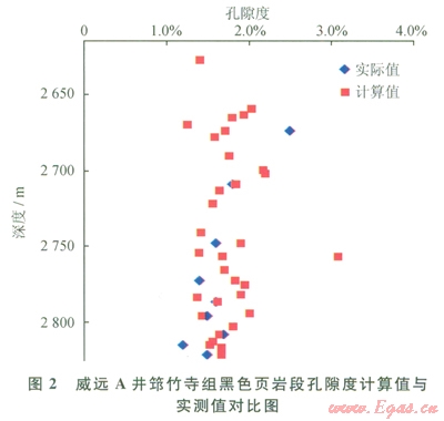 根據(jù)VBri、VClay、VTOC的計(jì)算結(jié)果,結(jié)合巖石礦物測(cè)試數(shù)據(jù),筆者對(duì)威遠(yuǎn)A井2630~2819m頁(yè)巖段的32個(gè)深度點(diǎn)(對(duì)應(yīng)的TOC為0.5%~3.6%)進(jìn)行了孔隙度測(cè)算,并將計(jì)算孔隙度與該深度段的實(shí)測(cè)孔隙度進(jìn)行對(duì)比(圖2)。對(duì)比結(jié)果表明,上述32個(gè)深度點(diǎn)的計(jì)算孔隙度與該井段實(shí)測(cè)孔隙度吻合,從而證實(shí)所選擇的3個(gè)刻度點(diǎn)以及VBri、VClay、VTOC計(jì)算值符合筇竹寺組頁(yè)巖儲(chǔ)集空間的實(shí)際地質(zhì)狀況,可以作為分析筇竹寺組孔隙構(gòu)成的有效方法和地質(zhì)依據(jù)。