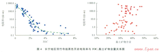 根據(jù)頁(yè)巖三層巖石物理模型[11],筇竹寺組、龍馬溪組等海相頁(yè)巖由脆性礦物、黏土層和有機(jī)質(zhì)等導(dǎo)電性差異極大的3類物質(zhì)組成。脆性礦物層由石英、長(zhǎng)石、方解石、白云石、黃鐵礦等物質(zhì)組成,孔隙極少,一般認(rèn)為只有黃鐵礦具有導(dǎo)電性,但黃鐵礦因質(zhì)量百分含量一般低于l0%且主要呈星點(diǎn)狀分布,因此對(duì)頁(yè)巖的導(dǎo)電性貢獻(xiàn)不大。黏土礦物主要由蒙脫石、伊蒙混層、伊利石、綠泥石等具有附加導(dǎo)電性的物質(zhì)組成,是形成碎屑巖低阻油氣層的主要介質(zhì)之一[23]。有機(jī)質(zhì)層一般不導(dǎo)電,但在極高成熟 變生階段因出現(xiàn)碳化現(xiàn)象則具有較強(qiáng)的導(dǎo)電性。根據(jù)Barnett頁(yè)巖和我國(guó)東西部低阻油氣層電性特征,細(xì)粒碎屑巖的導(dǎo)電性主要為泥質(zhì)/黏土礦物所控制,處于有效生烴窗內(nèi)的有機(jī)質(zhì)和烴類泥頁(yè)巖一般不導(dǎo)電。因此黑色頁(yè)巖電阻率一般隨著泥質(zhì)/黏土礦物增加而降低,隨有機(jī)質(zhì)豐度增加而升高[10,12,23],例如:渤海灣地區(qū)古近系一新近系砂泥巖低阻油氣層一般含有20%~65%黏土礦物,其電阻率大多為5~20W·m,且隨著黏土礦物含量增加而降低[23];川南龍馬溪組頁(yè)巖電阻率一般為8~40W·m,且總體隨著有機(jī)質(zhì)豐度增加而升高[10]。