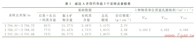筆者在威遠(yuǎn)A井2796.60~2796.72 m、2788.17~2788.32m和2707.59~2707.68m挑選3個(gè)黑色頁(yè)巖樣品(對(duì)應(yīng)的TOC分別為3.08%、l.73%、1.23%),對(duì)孔隙度數(shù)學(xué)模型進(jìn)行刻度(表1)。首先,根據(jù)3個(gè)深度點(diǎn)的巖礦、TOC和孔隙度等測(cè)試資料和孔隙度計(jì)算模型建立三元一次方程組,然后解方程組計(jì)算獲得VBri、VClay、VTOC這3個(gè)關(guān)鍵參數(shù)值。經(jīng)過計(jì)算,筇竹寺組黑色頁(yè)巖VBri、VClay、VTOC值分別為0.O002m3/t、0.022m3/t、0.069m3/t(表1)。這表明,筇竹寺組頁(yè)巖3種物質(zhì)單位質(zhì)量所產(chǎn)生的孔隙體積為有機(jī)質(zhì)最大、黏土礦物次之、脆性礦物最小。