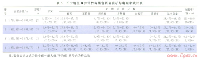 筆者依據(jù)長(zhǎng)寧地區(qū)B井筇竹寺組黑色頁(yè)巖的巖礦、地化和測(cè)井響應(yīng)資料,建立了中下部4段合計(jì)厚度159m頁(yè)巖的電阻率與TOC、黏土礦物的關(guān)系圖表(圖4、表3),以了解哪種物質(zhì)是控制頁(yè)巖導(dǎo)電性的主要介質(zhì)。此項(xiàng)研究的結(jié)果顯示,筇竹寺組黑色頁(yè)巖電阻率與黏土礦物含量無明顯相關(guān)性,但與TOC呈良好的負(fù)相關(guān)性,具體描述如下:①1730.88~1831.825m井段,厚度l01m,黏土礦物含量為28.4%~48.1%,TOC不足l%(平均0.42%),有機(jī)質(zhì)總體較少,頁(yè)巖電阻率值一般為220~686W·m,顯然是黏土礦物的導(dǎo)電性在發(fā)揮主導(dǎo)作用,并且呈現(xiàn)高阻特征;②l831.825~1851.565m井段,厚度20m,黏土礦物含量保持穩(wěn)定(29.2%~44.5%),而有機(jī)質(zhì)含量開始增加,TOC一般介于1.0%~2.2%(平均為1.3%),頁(yè)巖電阻率則下降至18~202W·m(多為l0~100W·m),頁(yè)巖電性出現(xiàn)由高阻向低阻過渡特征,這表明有機(jī)質(zhì)導(dǎo)電性開始顯現(xiàn),其電阻率較黏土礦物低;③1851.565~1871.46m,厚度20m,黏土含量略有下降(一般為24.2%~43.7%),有機(jī)質(zhì)含量增至l.9%~3.3%,頁(yè)巖電阻率則快速下降至0.9~7.6W·m,表現(xiàn)為明顯的低阻特征,這說明有機(jī)質(zhì)具有較低電阻率,并且開始主導(dǎo)頁(yè)巖地層的導(dǎo)電性;④l871.46~1889.77m,厚度18m,黏土礦物含量下降至l8%~40%(平均為25.1%),有機(jī)質(zhì)含量增加至2.2%~7.1%(平均為4.3%),頁(yè)巖電阻率則下降至0.1~1W·m,大大低于龍馬溪組頁(yè)巖和渤海灣地區(qū)低阻砂泥巖的電阻率,呈現(xiàn)超低電阻特征,這進(jìn)一步證實(shí)筇竹寺組頁(yè)巖有機(jī)質(zhì)具有較強(qiáng)的導(dǎo)電性(圖4、表3)。由此推測(cè),川南筇竹寺組頁(yè)巖中的有機(jī)質(zhì)可能出現(xiàn)了明顯的碳化現(xiàn)象,因而具有比黏土礦物更強(qiáng)的導(dǎo)電性,進(jìn)而導(dǎo)致富有機(jī)質(zhì)頁(yè)巖段(TOC>2%)具有低一超低電阻特征。