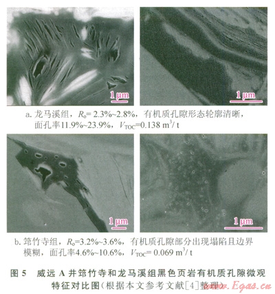 碳化不僅導(dǎo)致有機(jī)質(zhì)產(chǎn)氣能力降低,微觀結(jié)構(gòu)改變,導(dǎo)電性變強(qiáng),而且對(duì)有機(jī)質(zhì)孔隙發(fā)育也會(huì)產(chǎn)生影響。鄒才能、董大忠、李新景等通過對(duì)威遠(yuǎn)地區(qū)筇竹寺組(R。介于3.2%~3.6%)和龍馬溪組(R。介于2.3%~2.8%)頁(yè)巖樣品開展高倍電鏡(氬離子拋光處理后)觀察發(fā)現(xiàn),在相近尺度(比例尺刻度值為1mm)的電鏡資料中,筇竹寺組頁(yè)巖有機(jī)質(zhì)孔隙發(fā)育程度較龍馬溪組頁(yè)巖差(圖5),主要表現(xiàn)為:受有機(jī)質(zhì)碳化影響,筇竹寺組有機(jī)質(zhì)孔隙出現(xiàn)明顯的塌陷和充填現(xiàn)象,邊界模糊不清或呈弧形,孔徑變小,其中大量直徑小于40nm的孔隙因完全充填而基本消失(圖5-b右),進(jìn)而導(dǎo)致有機(jī)質(zhì)內(nèi)微孔隙體積大幅度減少,測(cè)試面孔率僅4.6%~l0.6%(圖5-b);相反,龍馬溪組頁(yè)巖有機(jī)質(zhì)孔隙不僅數(shù)量多,且形態(tài)輪廓清晰(多呈菱形或多邊形),較少出現(xiàn)充填現(xiàn)象,測(cè)試面孔率為ll.9%~23.9%(圖5-a)。鏡下分析表明,受有機(jī)質(zhì)碳化影響,筇竹寺組頁(yè)巖有機(jī)質(zhì)產(chǎn)生的微孔隙體積明顯比龍馬溪組少,這與前面的計(jì)算結(jié)果(筇竹寺組的VTOC僅為龍馬溪組的1/2)相吻合。
