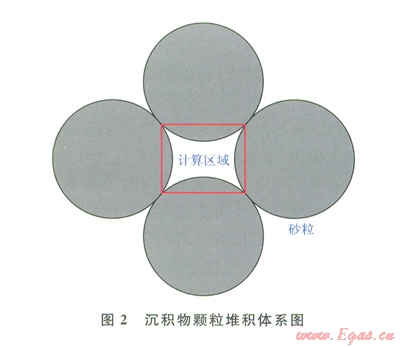 由于沉積物孔隙內(nèi)水合物實際生成過程比較復(fù)雜,因而模型對物理過程進(jìn)行了簡化,假定所有沉積物顆粒都為正網(wǎng)形且粒徑分布均一,沉積物體系內(nèi)各向同性。自然界中,沉積物層位于海底,由于海水和沉積層的壓力,沉積物顆粒被壓實,孔隙水充填于沉積物孔隙內(nèi)部,氣體溶解于填充的孔隙水中。沉積物顆粒間彼此錯落排列,形成沉積物間孔隙的是顆粒的圓弧面,計算區(qū)域的邊界為沉積物顆粒的弦長,如圖2所示。邊界條件采用反彈邊界。