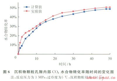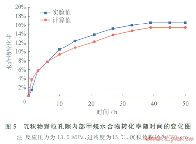 為了驗證模擬結(jié)果的可靠性,將模擬結(jié)果與實驗結(jié)果進(jìn)行對比,如圖5、6所示。實驗得到的甲烷水合物和二氧化碳水合物的轉(zhuǎn)化率均大于模擬結(jié)果。這主要由以下幾個因素造成。