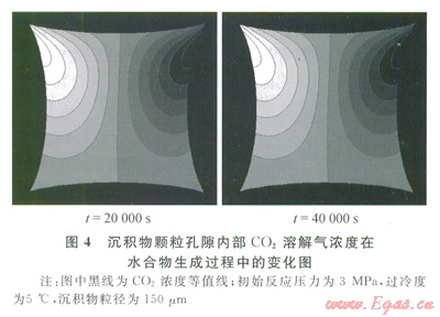 首先,實驗采用的沉積物并非是孔徑為150mm的均一顆粒,而是介于l50~250mm的區(qū)間,因此,形成的顆粒間的孔隙尺寸也就不統(tǒng)一,孔隙尺寸分布呈一定區(qū)間,對孔隙空間內(nèi)水合物生成過程的影響也就不盡相同,而模型模擬的是沉積物粒徑為l50mm的孔隙空間,孔隙尺寸是恒定的。其次,實際實驗過程中,氣體與沉積物體系的交界面處最容易生成水合物,同時,界面處的水合物容易通過毛細(xì)作用將沉積物體系內(nèi)孔隙水運移到水合物周圍,而水合物生成區(qū)域的擴散傳遞作用是最強烈的。氣體的擴散時刻都在發(fā)生,可能直接擴散進(jìn)入沉積物孔隙水里,也可能直接擴散進(jìn)入水合物中,生成水合物,而模型的假設(shè)是氣體必須首先擴散進(jìn)入沉積物孔隙水中,再從孔隙水中通過水合物膜表面擴散生成水合物。因此,綜合考慮,模擬結(jié)果與實驗結(jié)果存在一定的偏差,但誤差比較小,誤差范圍為3%~7%,模型結(jié)果基本可靠。