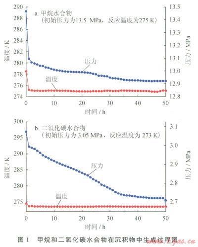 在進(jìn)行數(shù)值模擬之前,對甲烷和二氧化碳?xì)怏w水合物的生成過程先進(jìn)行了實驗室模擬,實驗?zāi)M裝置主要由管路、氣瓶、增壓裝置、真空泵、恒溫水浴和反應(yīng)釜組成,具體見本文參考文獻(xiàn)[12]。沉積物樣品選用南海淺表層沉積物,人工進(jìn)行清洗并干燥,后進(jìn)行篩分,按照一定的粒徑進(jìn)行分類。本次實驗粒徑分布介于60~100目的沉積物,測得其孔隙度為36.7%。甲烷水合物和二氧化碳水合物生成過程分別在不同的溫度和壓力條件下進(jìn)行,觀測水合物生成過程中體系內(nèi)溫度和壓力的變化。實驗結(jié)果如圖1所示。