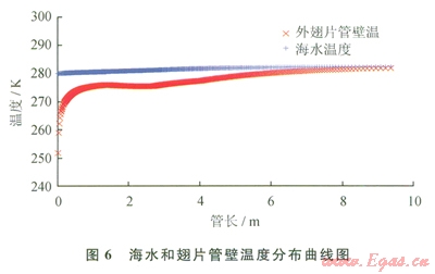 圖6給出了整個換熱管上翅片管壁和海水的溫度分布曲線。海水流量較之LNG流量大得多,所以其溫度變化不大。在1m以下的位置,管壁的溫度急劇降低,甚至低于冰點,很容易導(dǎo)致靠近壁面的海水結(jié)冰。該區(qū)域確實也是結(jié)冰情況較嚴(yán)重的區(qū)域。