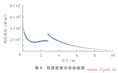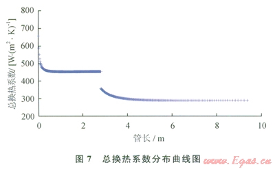 圖7、8分別給出了反映SuperORV整體換熱性能的總換熱系數(shù)和熱流密度的分布曲線。可以看到,在氣化段和加熱段過渡區(qū),2條曲線都出現(xiàn)了跳躍。這是由于SuperORV結(jié)構(gòu)上的變化引起的。圖7中,氣化段的總換熱系數(shù)總體優(yōu)于加熱段的總換熱系數(shù)。圖8中,加熱段開頭的熱流密度先高于氣化段末尾的熱流密度而后逐漸下降,這是由NG流體混合前后的溫度變化引起的,從氣化段出來的2個流道里的流體混合后導(dǎo)致溫度有大的下降,而后隨著加熱溫度又逐漸上升。