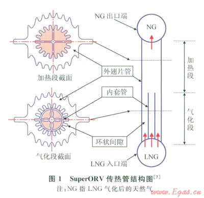 開架式氣化器(ORV)是一種以海水為熱源的氣化器,是液化天然氣(LNG)接收終端中用于基本負荷的大型氣化裝置,但由于海水容易在該氣化裝置底部結(jié)冰,使得裝置盼傳熱性能下降,導(dǎo)致其氣化性能無法得到進一步的提升。超級開架式氣化器(SuperORV)是在ORV基礎(chǔ)上二的改進版本,其傳熱管可分為氣化段和加熱段兩部分(圖1)。加熱段中采用雙層結(jié)構(gòu)的傳熱管,使得管外結(jié)冰的狀況得到了進有效的改善。據(jù)有關(guān)技術(shù)數(shù)據(jù)[1-2],SuperORV可以使氣化裝置的氣化能力提高3倍,海水流量和安裝空間可分別減小15%和40%。
