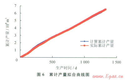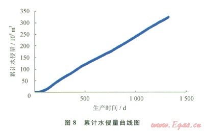 采用筆者提出的方法對該氣藏的動態(tài)儲量進(jìn)行分析,首先將2口生產(chǎn)井等價為1口井,再利用實測地層壓力為約束條件,采用氣藏生產(chǎn)動態(tài)數(shù)據(jù)進(jìn)行擬合,產(chǎn)量、壓力、累計產(chǎn)量擬合曲線如圖4~6所示,歷史擬合效果好。圖7為該氣藏的壓降關(guān)系曲線,由壓降關(guān)系式P/Z=-0.711Gp+21.661,可推出該氣藏的動態(tài)地質(zhì)儲量為30.4×108m3。從圖8可以看出,目前累計水侵量達(dá)300×104m3,表明水體活躍程度高。