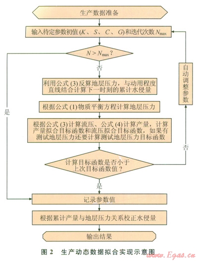 最終水侵量的確定既要通過生產(chǎn)歷史擬合結(jié)果又要通過地層壓力變化校正。這樣既考慮了水侵對地層壓力的影響,又考慮了物質(zhì)平衡方程,其實現(xiàn)框圖如圖2所示。計算步驟為:①數(shù)據(jù)準(zhǔn)備(基礎(chǔ)數(shù)據(jù)、生產(chǎn)動態(tài)數(shù)據(jù)、試井解釋結(jié)果參數(shù))和迭代次數(shù);②確定需要擬合的待定參數(shù),假設(shè)待定參數(shù)的初始值的范圍、初始動態(tài)地質(zhì)儲量,確定動用儲量直線;③根據(jù)參數(shù)用式(3)計算歹;加,根據(jù)無因次壓力的定義跏反算地層壓力,根據(jù)地層壓力與累計產(chǎn)氣量關(guān)系作如圖l所示的曲線,根據(jù)視地層壓力與動用儲量線的差值計算下一個時刻的累計水侵量,根據(jù)物質(zhì)平衡方程計算下一個時刻的地層壓力,根據(jù)式(3)、(4)計算流壓和產(chǎn)量,計算流壓擬合目標(biāo)函數(shù)、產(chǎn)量擬合目標(biāo)兩數(shù)及地層壓力目標(biāo)函數(shù);④判斷迭代次數(shù)是否結(jié)束,若沒結(jié)束,就與上次目標(biāo)值比較,如果比上次值小,且記錄目前參數(shù)值,如果比上次值大,重復(fù)步驟②,調(diào)整參數(shù),如果達(dá)到最佳擬合轉(zhuǎn)入步驟④;如果迭代次數(shù)完成,輸出結(jié)果。