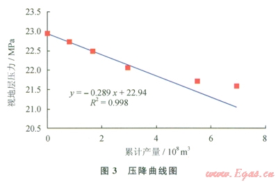 以南海東部PY30-1氣田某氣層為例,該氣藏為邊水氣藏,目前投產(chǎn)了2口井。通過實測數(shù)據(jù)點作出該氣藏的壓降曲線如圖3所示。